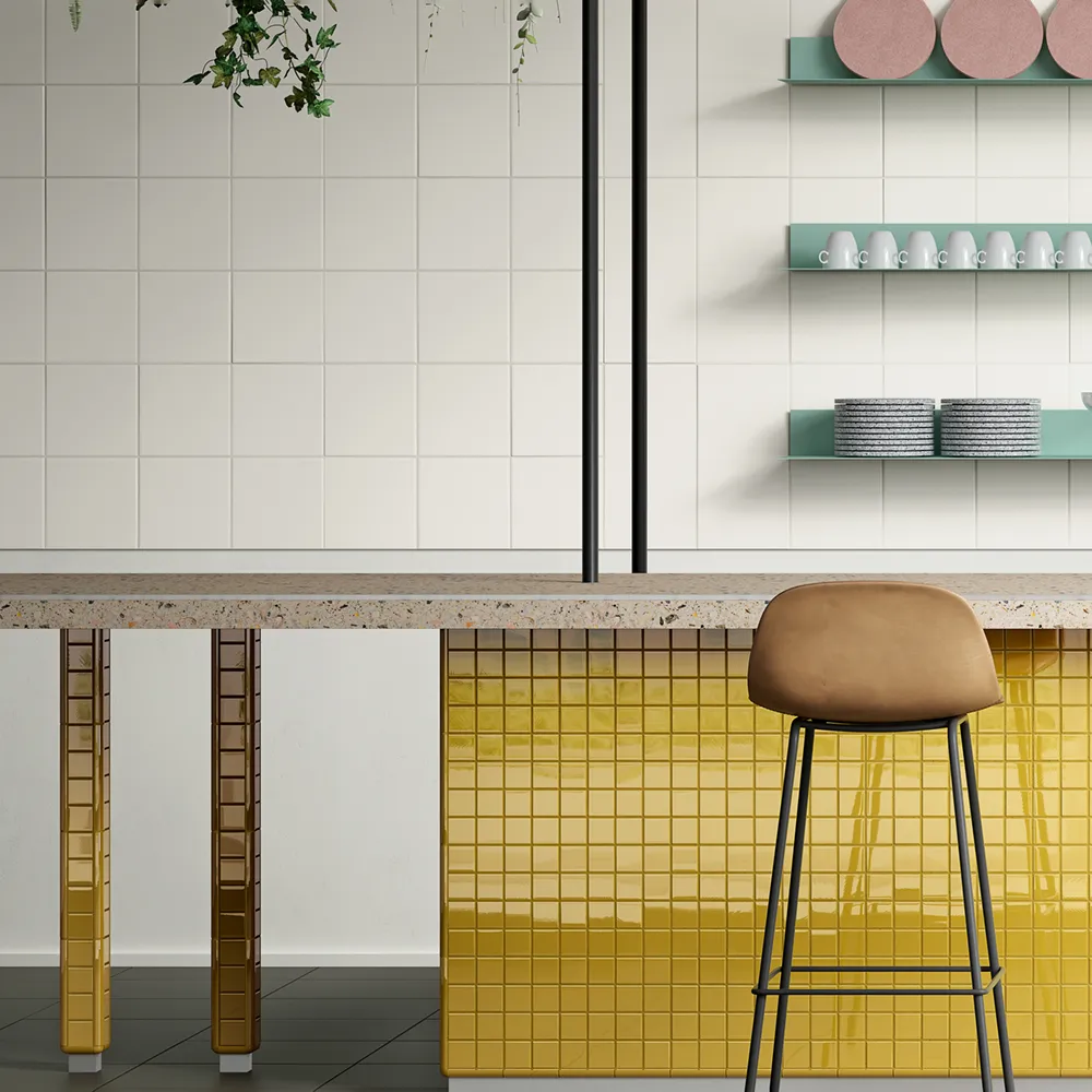 La gamma dei formati è altrettanto versatile: dal tradizionale 10×10 al dinamico 5×20, passando per il 10×20, i mosaici e i moduli triangolari. Questa varietà dimensionale apre la strada a infinite soluzioni di posa: dai raffinati schemi a spina di pesce alle composizioni regolari e minimaliste, fino a layout più creativi e dinamici.